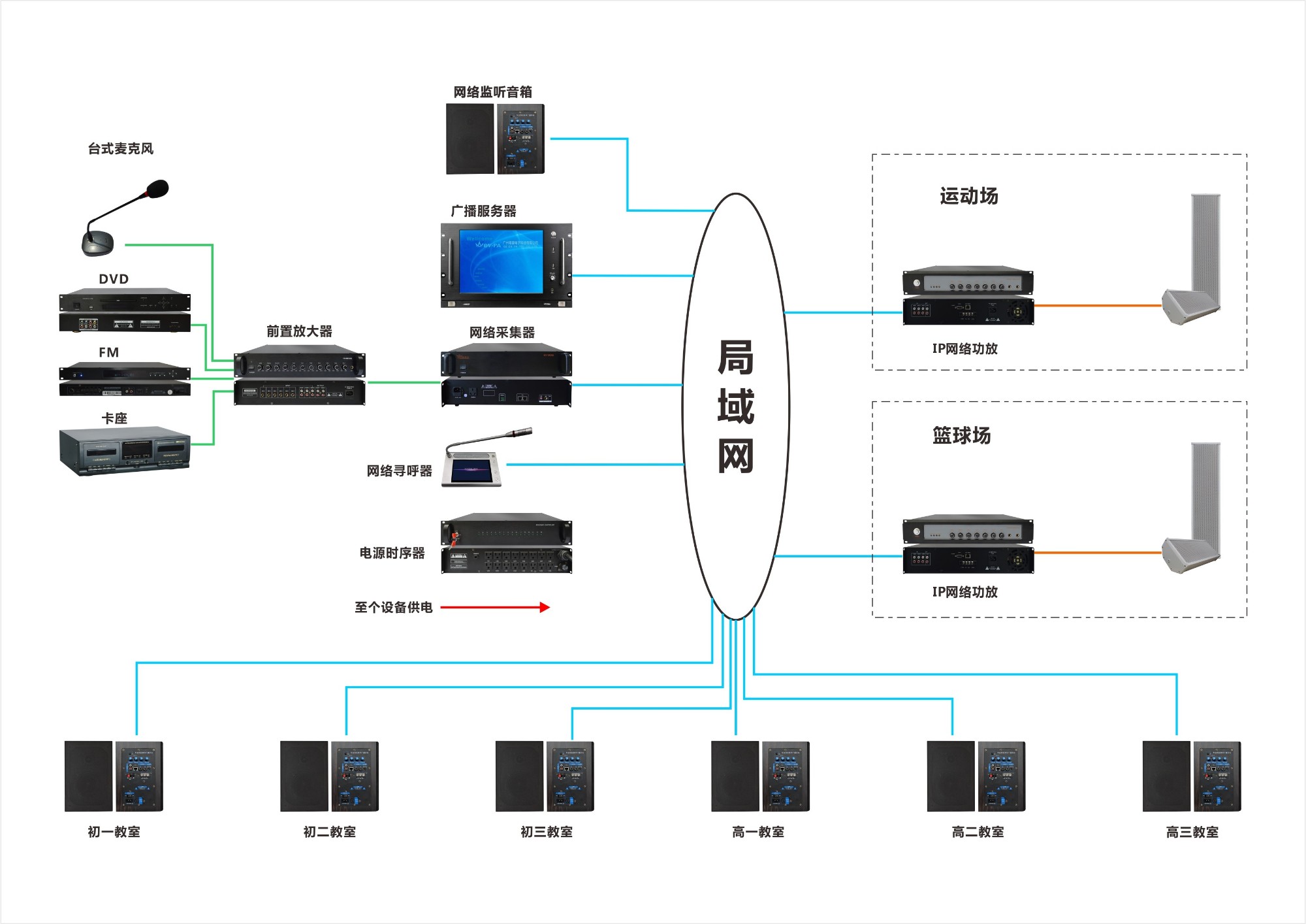為配合學校完善現(xiàn)代化的教學管理,推動教育信息化建設,開展教學信息的傳播等,廣州粵賽本著實用性、先進性、可靠性、開放性、兼容性標準化為原則,特為威信二中設計了集 廣播、多媒體教學、高考聽力考試等多功能的IP網(wǎng)絡廣播系統(tǒng)。