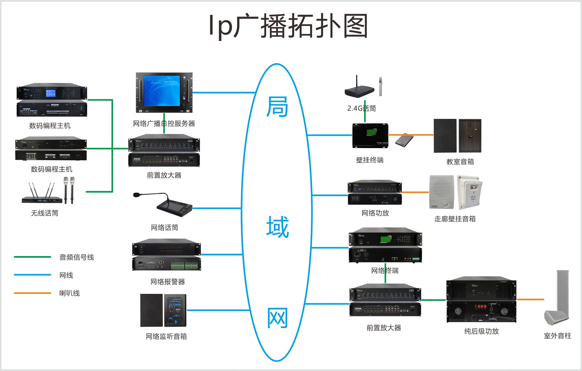 為配合學校完善現(xiàn)代化的教學管理,推動教育信息化建設,開展教學信息的傳播等,廣州粵賽本著實用性、先進性、可靠性、開放性、兼容性標準化為原則,特為靖西六中設計了集 廣播、多媒體教學、高考聽力考試等多功能的IP網(wǎng)絡廣播系統(tǒng)。